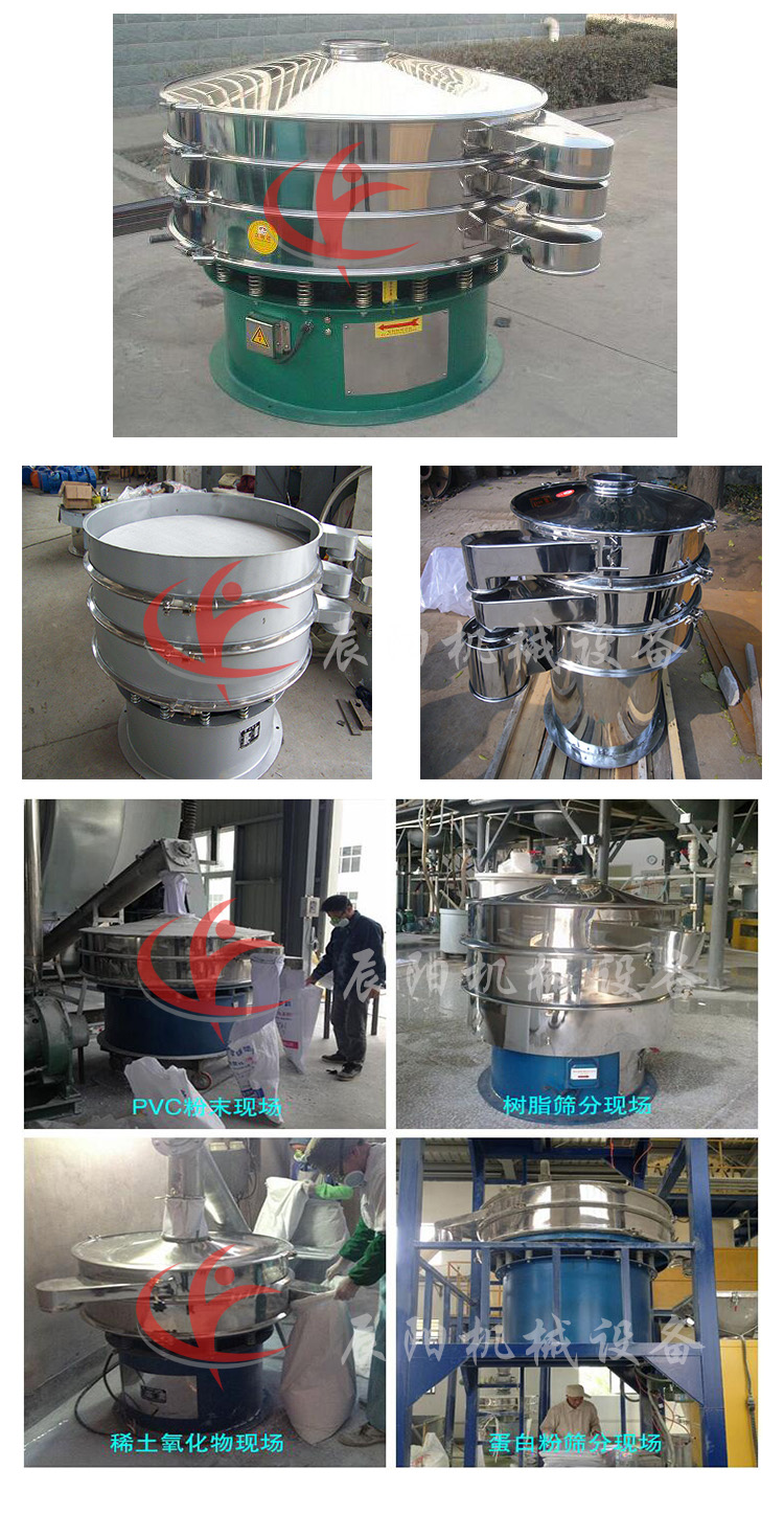 旋振篩由直立式振動電機、普通電機拖動激振器兩種振動方式,振動源上下兩端安裝有偏心重錘。下兩端重錘,配置不同,激振源在旋轉(zhuǎn)時,產(chǎn)生水平、垂直、傾斜的三次元運動,再把這個運動傳遞給篩面。調(diào)節(jié)上、下兩端的相位角,可以改變物料在篩面上的運動軌跡,達到精細篩分、除雜、過濾 的目的。